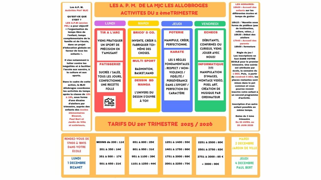 Découvrez le programme des A.P.M. (Activités Péri’ MJC) anciennement PEL pour la période du 29 septembre au 19 décembre 2025